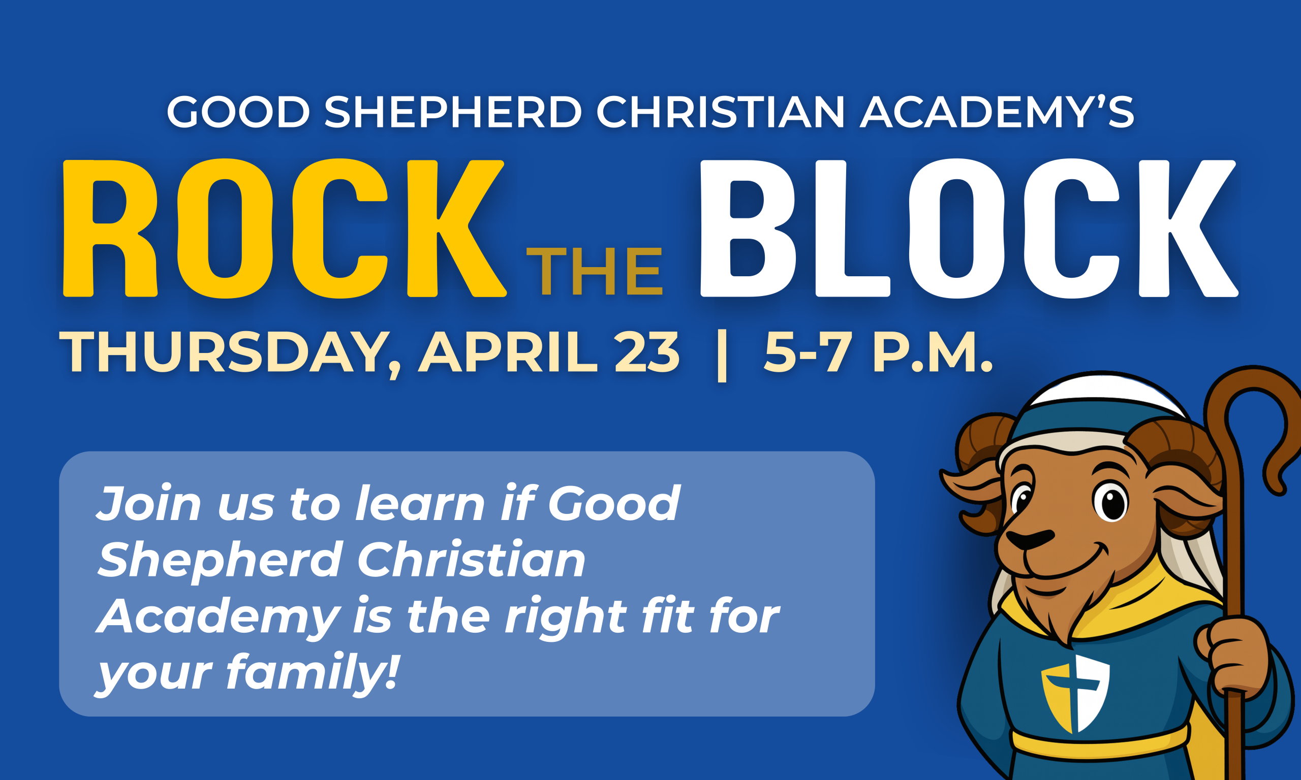 Good Shepherd Christian Academy invites families to Rock the Block on April 23 from 5 to 7 p.m. This free community event is designed for families who want to learn more about the school and see if Good Shepherd could be the right fit for their children. Guests will have the opportunity to tour the school, meet staff members and learn more about the academy’s Christ-centered approach to education.
